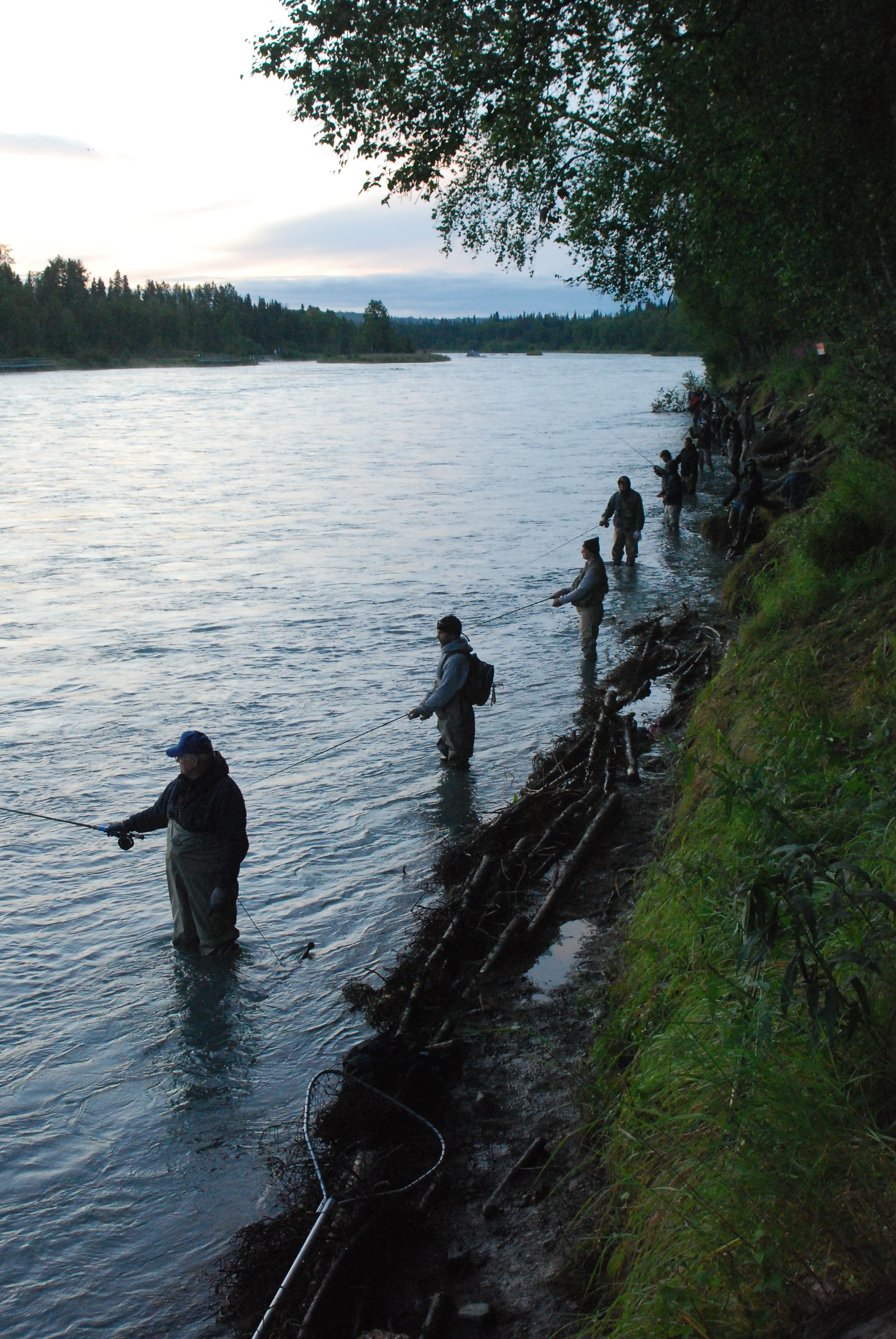 Saturday night we attended a potluck dinner hosted by the campground. They provided delicious fried rockfish, and the campers brought side dishes. The food was good, and we had a great time sharing stories. One of the fishermen had been busted by an Alaska State Fish and Game Officer for having an Alaska resident’s fishing license, although he was a Californian. He also had two too many fish in his boat, so the Trouper took two fish and gave him a $340 ticket for the violations. Stephen’s investment of $145 for a non-resident fishing license was looking good. One of the small girls at the dinner fell in love with Volodya and spent the evening feeding him potato chips. On Sunday we drove in the rain to Soldotna. The rain stopped in the early evening leaving clear skies, and Volodya and Stephen arose at 4:00 a.m. on Monday to go fishing. They were home by 6:30 a.m. with a six-pound sock-eye salmon. There was a high number of fishermen on the river, but everyone was behaving, and they assisted each other to land the fish that were caught. It sounded far too civilized to be the “combat fishing” about which we have heard so much.