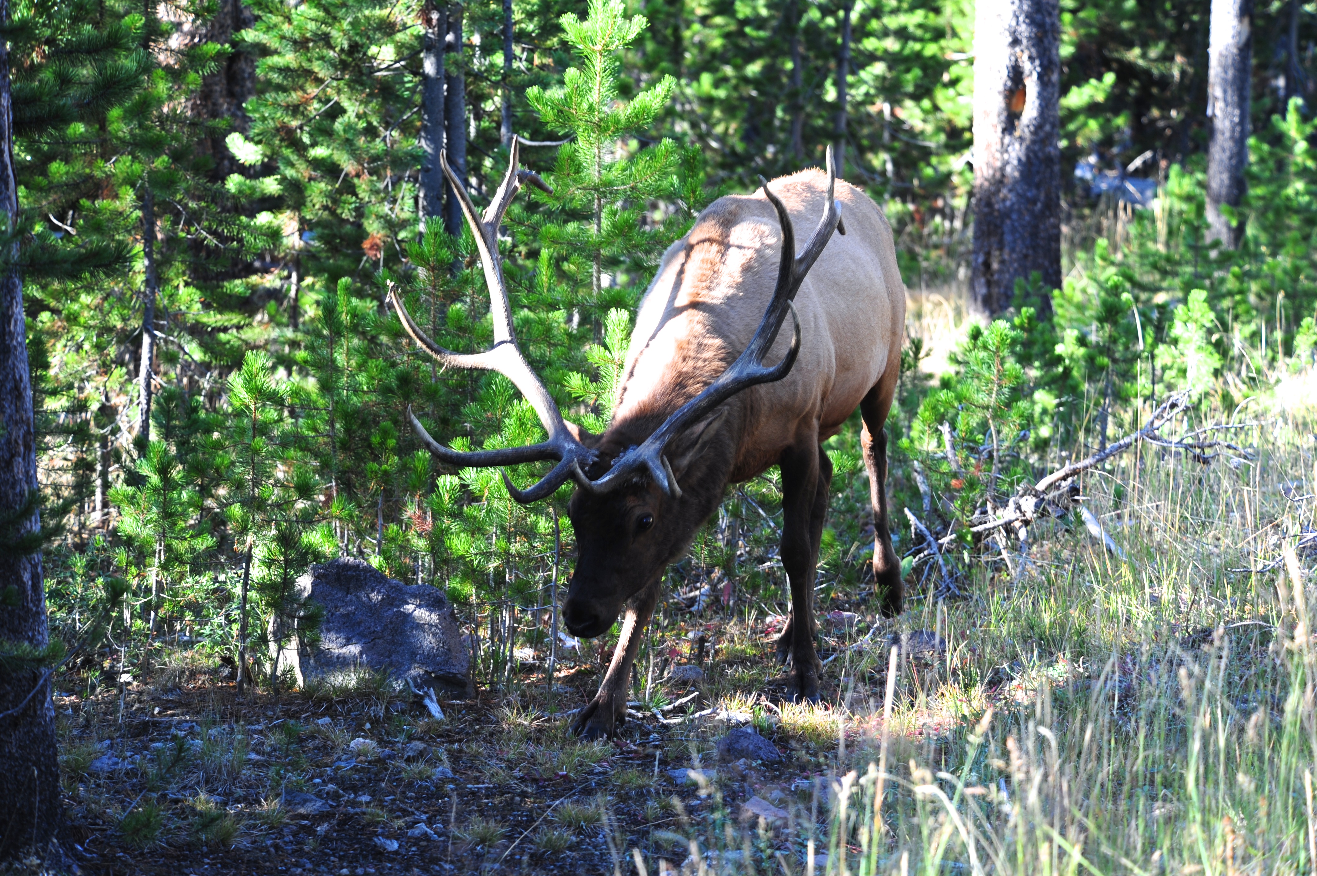 By Friday the weather was clear, and we set out in search of Yogi and BooBoo. The first animal we saw was an elk with an enormous rack of antlers. He was casually munching away with complete disregard to the traffic jam he had created.