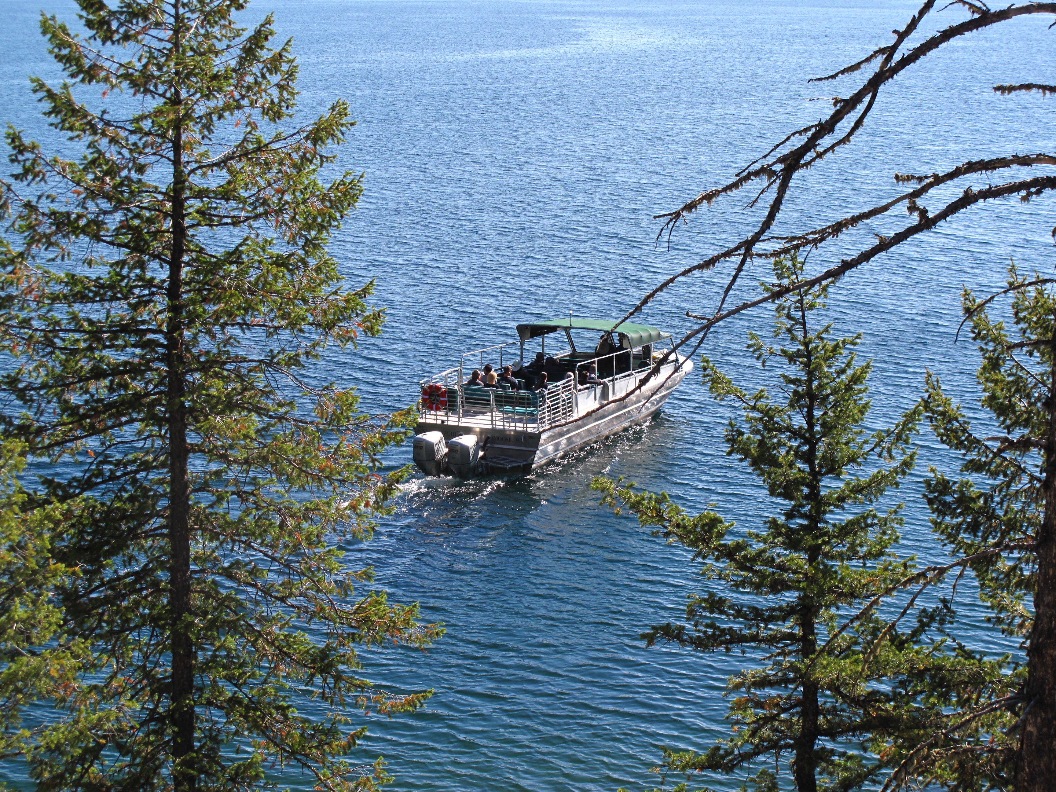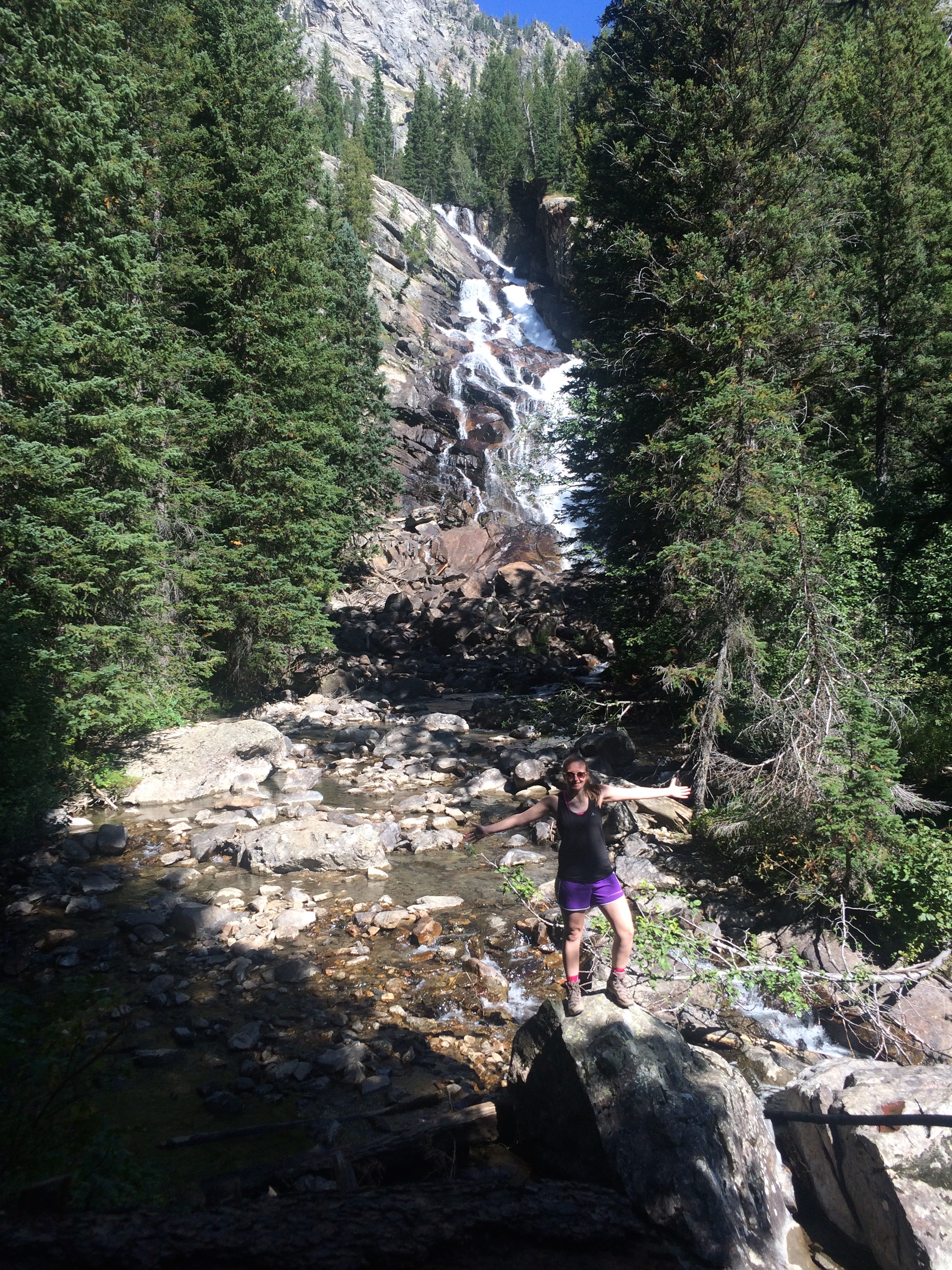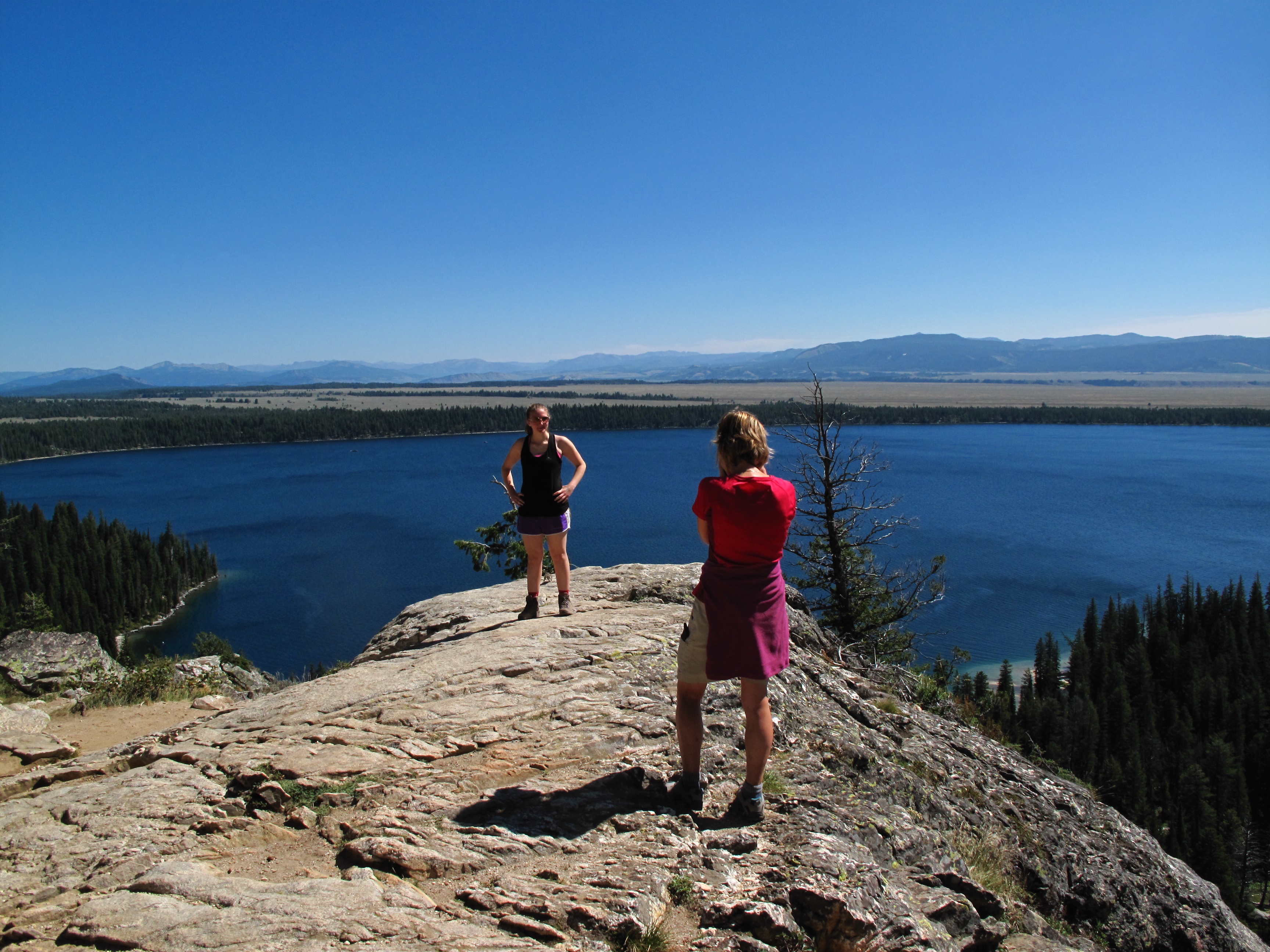 We went back to the trailer and had breakfast and then drove to the boat dock at Jenny Lake, where we cruised across the lake to do some hiking. We all walked (Well, Donna climbed and staggered.) up to Hidden Falls, and then Donna returned to the truck while the rest of the group went on to Inspiration Point. Donna found Respiration Point at the boat dock. Viky made friends with a squirrel. We hope it was as good for the squirrel as it was for Viky.