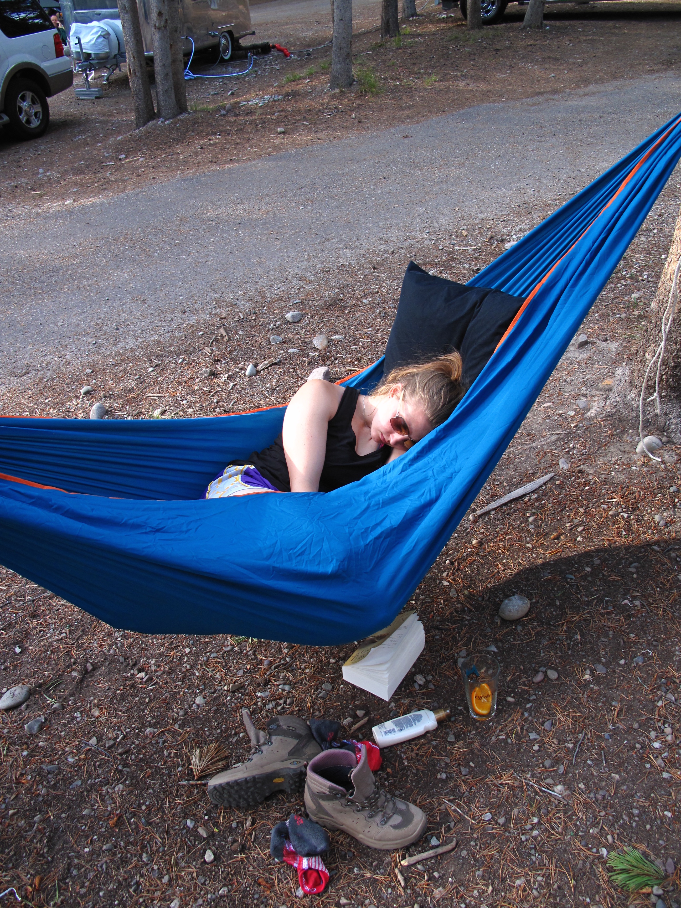 The hikers were all a bit tired from their efforts, so we had a bit of downtime when we got back to the trailer. Viky had brought a hammock, and she hung it from trees at various campgrounds and had little naps. Colter Bay RV Park is one of our favorite parks. All the sites are in lines and are fairly small, but there are trees between sites, and it has a park-like feel. The last time we were here with Christopher and Michael, a short microburst storm brought down several pine trees that crushed some vehicles and RV’s. All was calm this time.