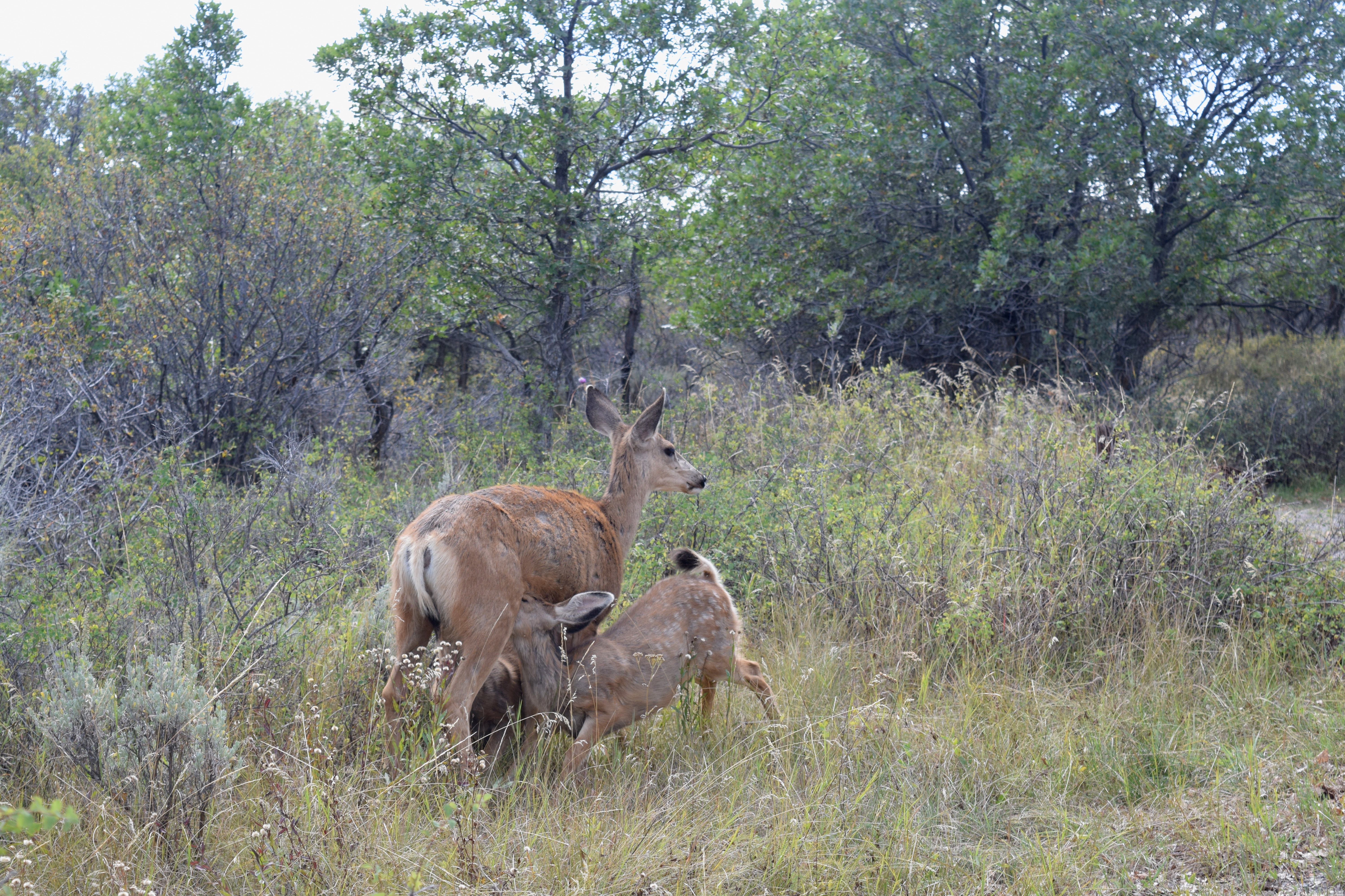 Black Canyon is a starkly beautiful area with viewpoints overlooking the Gunnison River far below. As we finished the Rim Rock Trail hike, we saw a mule deer doe nursing two fawns. They must have known it wasn’t hunting season, because our presence didn’t alarm them.