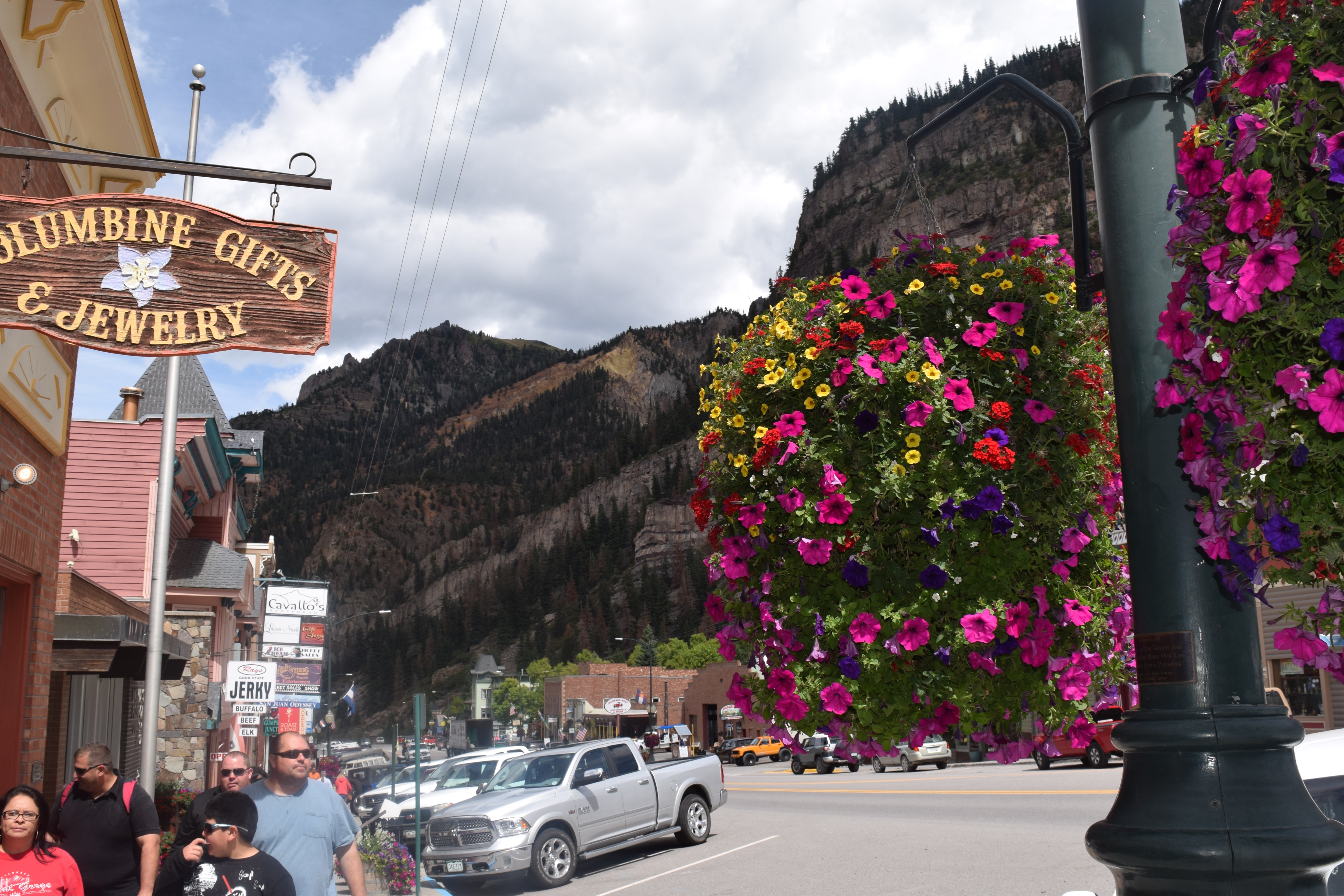 Monday’s drive was to Curecanti National Recreation Area, across the Million Dollar Highway and through Ouray. Stephen has a book that describes various mountain passes in the western USA, and, had he read the book before we drove the road, we would have gone through Telluride instead of Ouray. There are many sharp hairpin turns, a narrow road with the edges crumbling into the valley, and three mountain passes. Still, he and his 35 foot Fifth Wheel made the trip with a lot of bikers and few other RV’s. Ouray is such a fun little town, and it was hopping on this Labor Day. We cruised the street, Viky bought a ring, and then we had lunch on a patio with a guitar-playing singer.